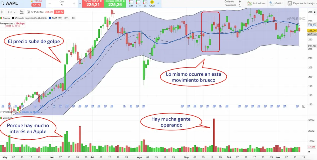 Un aumento del volumen durante una subida del precio refuerza la validez de una tendencia alcista, mientras que una subida con bajo volumen puede ser una señal débil o engañosa.